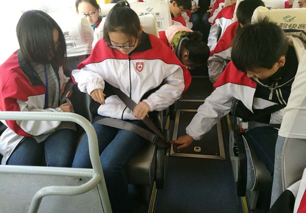 疏散演练正式开始,在后勤保障组施放烟雾之后,现场总指挥发布指令:“车辆起火,立即疏散”;所有学生立即解开安全带,引导老师利用应急手动开关打开乘客门后引领学生开始撤离;学生面向疏散门方向,按车厢过道两侧先左后右,再左再右的次序,每次一路纵队疏散;辅助老师辅助扶持下车困难的学生迅速撤离。整个演练过程做到了不抢道、不惊慌、听指挥、有秩序。到达集结区后,各班引导老师再次整队向现场总指挥报告了人员统计信息。