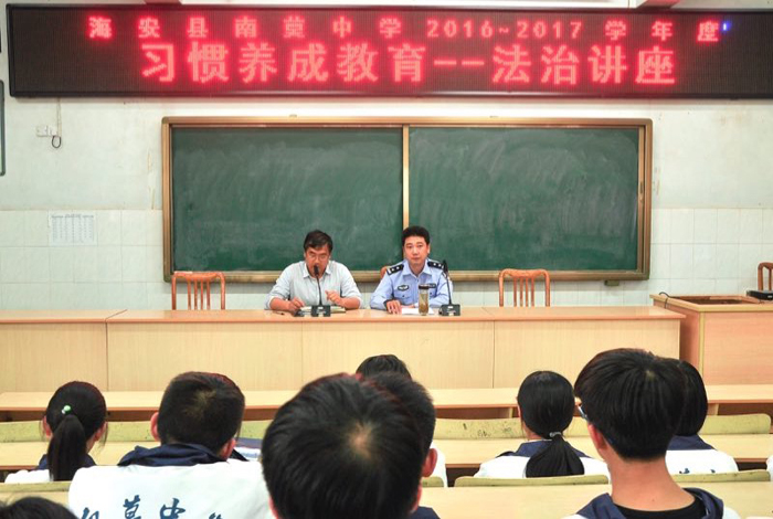 5月16日,海安县公安局南莫分局周捷所长在南莫中学为全体学生作了一场以安全为主题的法治讲座。