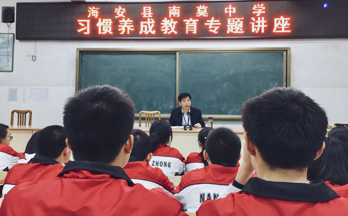10月17日下午第四节课,海安县南莫中学习惯养成教育专题讲座在多媒体报告厅举行。本次讲座有幸邀请南莫中学党支部书记、校长苏中潜主讲,南莫中学全体学生、班主任聆听,让全体师生与良好行为习惯有了一场优雅的邂逅。