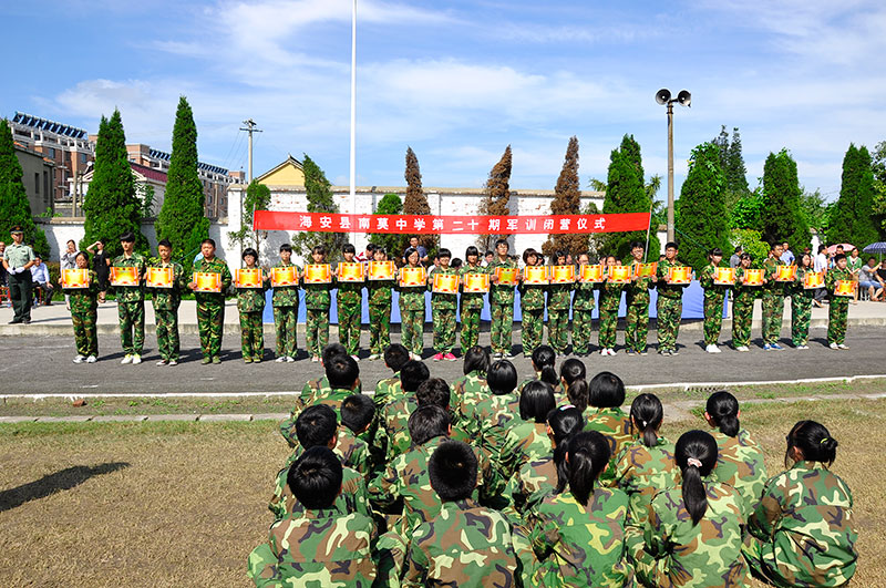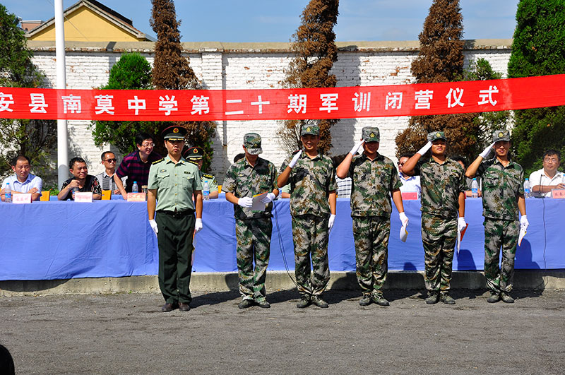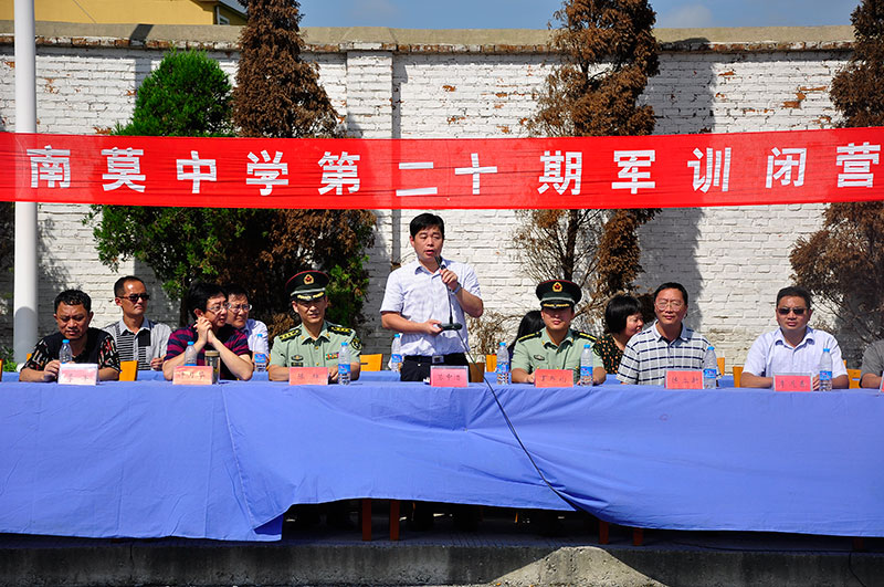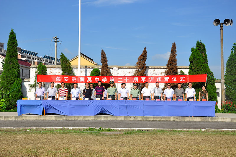 表演结束后,首先由学生代表发言,畅谈了军训的真切感受。接着,学校校长、党总支书记苏中潜同志致辞,他代表学校向军训中付出辛勤努力的各位教官表示诚挚的感谢,向军训中迅速成长的参训同学表示衷心的祝福,并希望同学们能把军训的精神延续到今后的学习生活中去。县委常委、人武部政委陈辉作重要讲话,他充分肯定了军训的成果,认为通过短短的七天军训,同学们不仅掌握了站军姿、整内务、军体拳等基本技能,更重要的是高扬了精神,开阔了视野,提升了境界,希望大家把军训中形成的严格规范、知难而上、百折不回、勤学苦练的精神运用到学习中去,学好科学文化知识,志存高远,追求卓越,努力成才,回报社会。政教处莫春年主任宣读了表彰决定,苏中潜、陈辉、许月华、丁邦均等领导为获奖集体和个人颁发了奖状。最后,苏校长高声宣布海安县南莫中学第二十期军训闭营,闭营仪式在雄壮的中国人民解放军军歌声中圆满结束。(吴铁官)