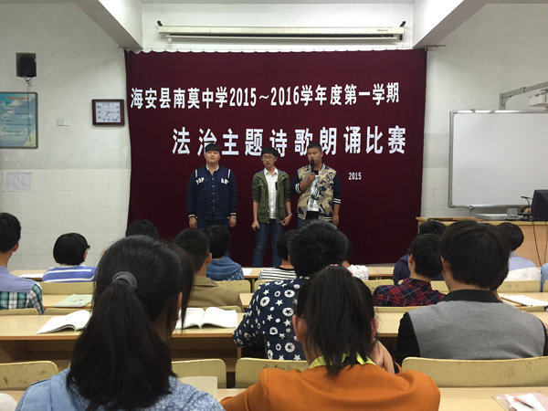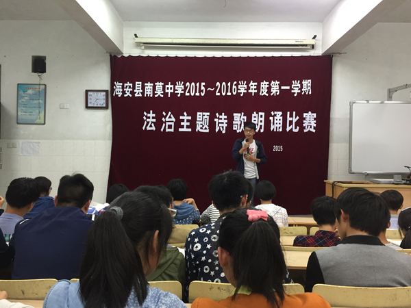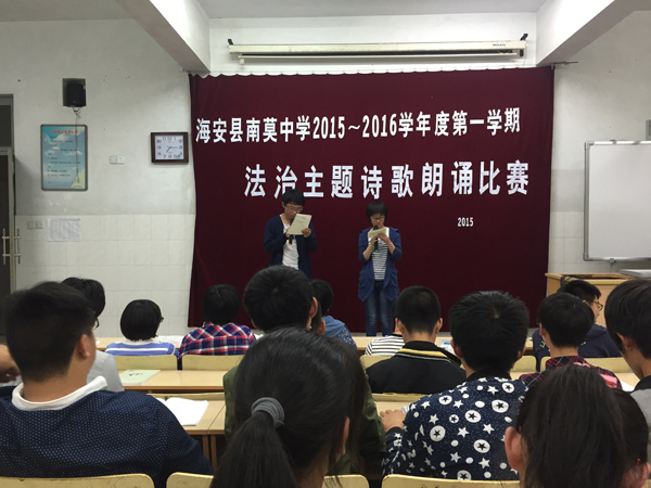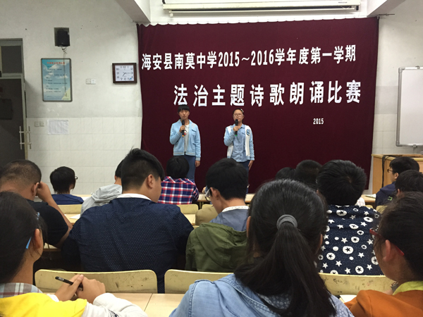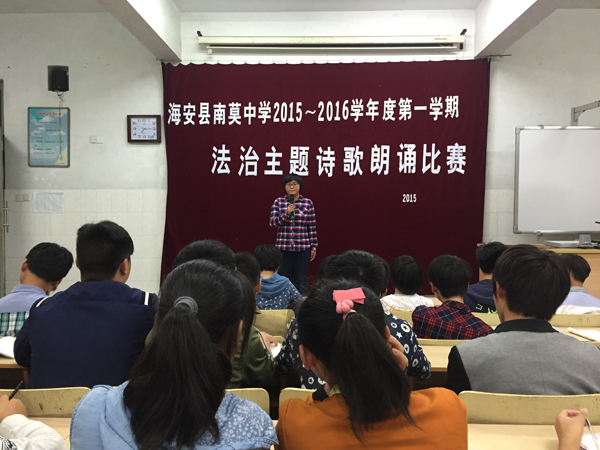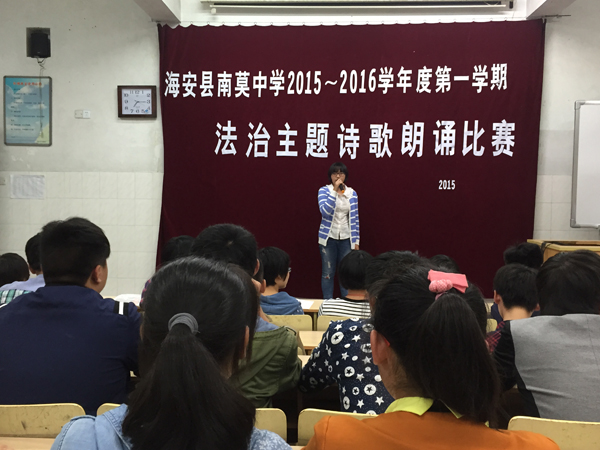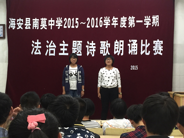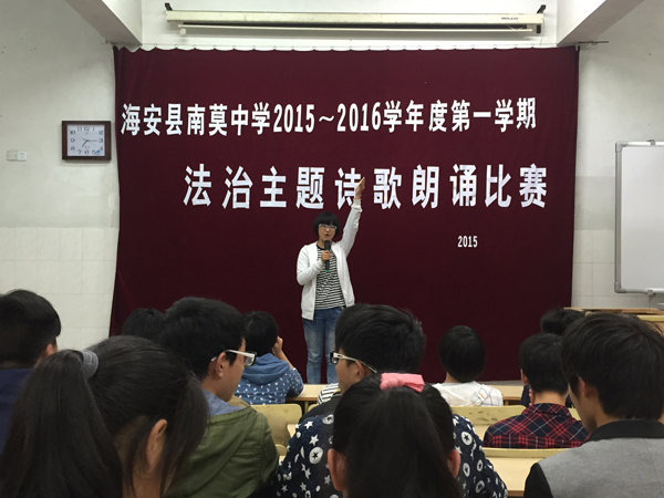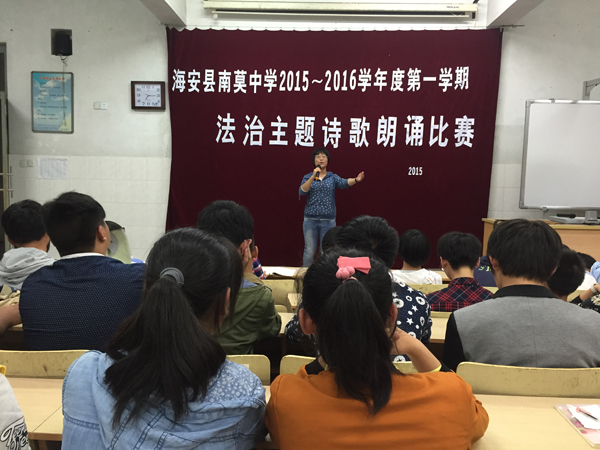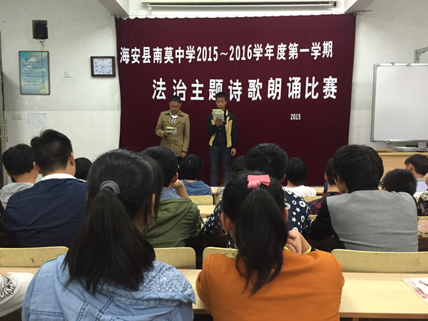 为进一步加强青少年法治宣传教育,培养青少年尊法、学法、守法、用法观念,以法治精神塑造人,以法治信仰引导人,形成人人崇尚法治的校园氛围,进一步深入推进“法治南中”建设,9月29日晚,海安县南莫中学在多媒体报告厅开展了“青春与法同行”为主题的诗歌朗诵比赛。