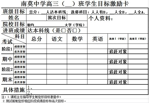 作为学生发展指导中心,肩负着为学生的发展出谋划策、提供帮助的重担,学期初学生发展指导中心根据不同年级的学生学业要求,分别设计了《南莫中学学生目标激励卡》,供学生制定目标,分阶段实施,及时对照、调整,且成效显著。2016年高二年级参加小高考,过关率高达98.6%,进入全县前列;在期中联考中,同学们都取得了喜人的成绩!其实,中学生最需要激发兴趣和点亮梦想,而梦想是成长的发动机,发动机在不停的转动,人就可能做到人生有目标,做事有计划,有动力。
