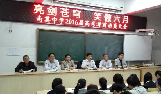 高三学子历经12年的寒窗苦读, 12年的厉兵秣马,将在六月中接受考验,开花结果,孕育成功!6月4日晚6点在揽月楼大阶梯教室召开了2016届高考考前动员大会,到会的领导有学校党支部书记、校长苏中潜同志,分管全校教学、挂帅高三年级部的崔益根副校长,负责高考送考交通、饮食的李慧副校长,以及分管高三年级的刘云、华锦圣副主任,会议由教务处黄顺华副主任主持。