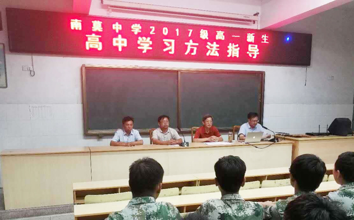 8月8日正值南中高一新生的军训期间,晚上七点,揽月楼大阶梯教室内灯火辉煌,座无虚席。七点二十整,南莫中学高一新生学习方法指导会议正式拉开帷幕。
