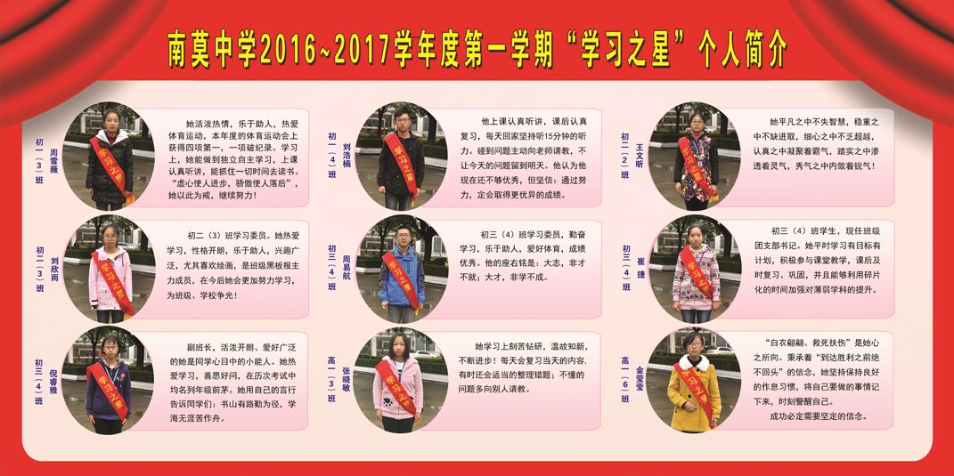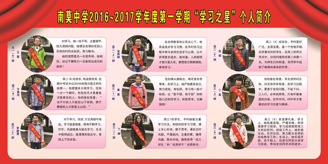 为全面贯彻党的教育方针,倡导良好学习风气,充分发挥典型育人的作用,促进学生全面发展,推进和谐校园建设,11月中旬,学校开展了本学期校园“学习之星”的评选活动,活动由学生发展指导中心组织,经各年级组自主申报,全体班主任、学生进行投票,最后学校综合评议,共评选出18名校园“学习之星”(名单及个人简介见附件)。