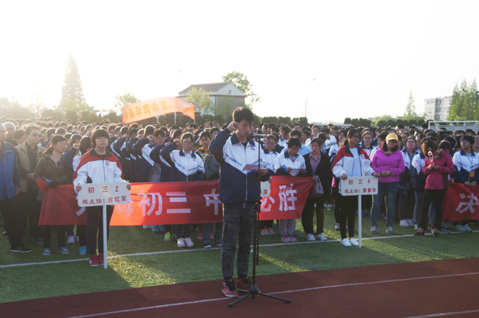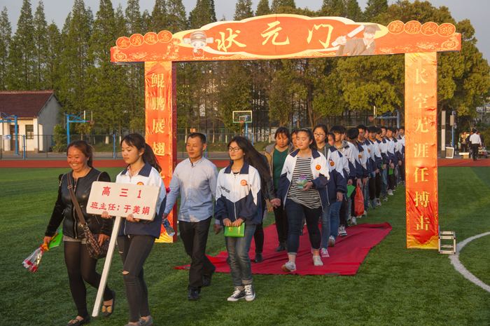 当主持人宣布大会正式开始后, 全体 高三学生 和初三学生 在班主任带领下,牵着家长的手,踩着《年轻的战场》青春的节拍,一同走过成人门和状元门,列队于学校主席台前红地毯两侧。准备就绪后,一千多与会师生齐唱国歌,隆重而庄严。