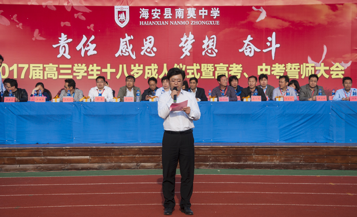 4月18日下午,海安县南莫中学举行了以“责任、感恩、梦想、奋斗”为主题的2017届高三学生“十八岁成人仪式暨高考 、 中 考 誓师动员大会”。 全校师生、全体高三、初三学生家长共同见证了同学们这一生中无比庄严的时刻,分享了孩子们成长的快乐。