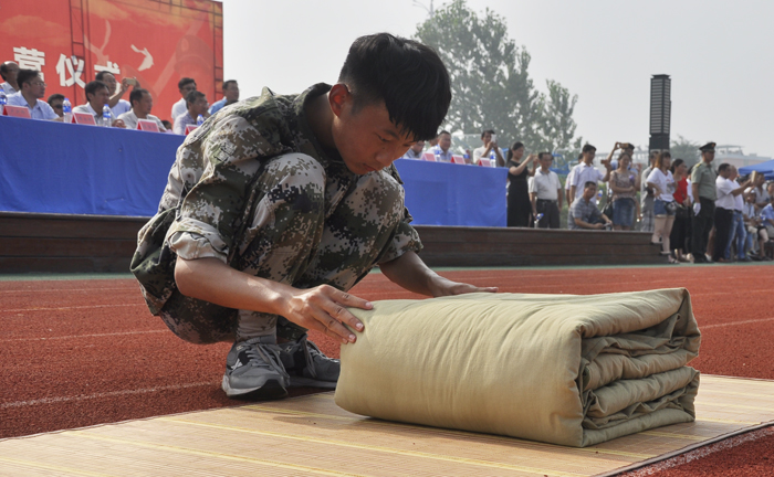 接着,由高一新生组成的八个方队依次通过主席台,同学们整齐的步伐、洪亮的口号,展现了南中学子良好的精神风貌。随后进行了队列训练展示和军体拳、擒拿拳、内务整理技能等汇报表演,同学们昂扬的斗志、英姿飒爽的风采和精彩的表演,赢得了在场领导和家长们的阵阵掌声。