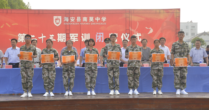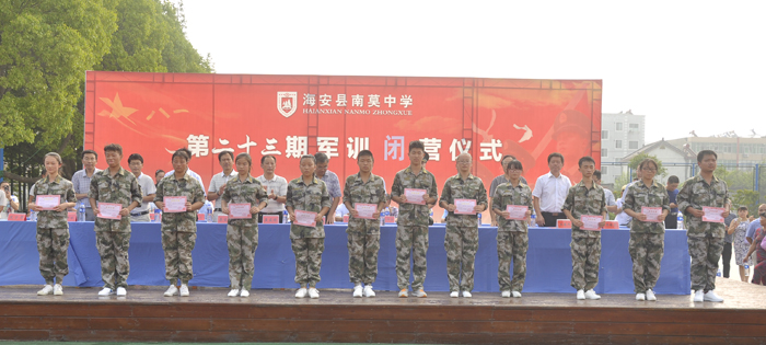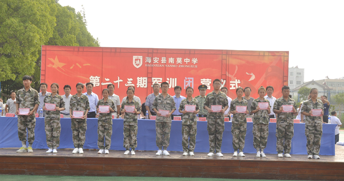 8月10日上午,海安县南莫中学第二十三期军训闭营仪式在田径运动场隆重举行。县人武部政工科科长周吉荣、全体军训教官、班主任、高一新生家长以及学校全体中层以上干部出席闭营仪式。闭营仪式由副校长陈立新主持。