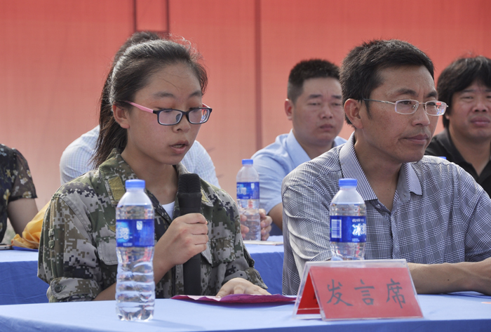 学生代表高一(8)班刘诗雨同学代表高一全体新生畅谈了军训收获,向一周来教官的严格要求、悉心指导,老师的细心照顾、谆谆教导表示感谢。她代表高一全体同学承诺,一定会把积极向上,顽强拼搏,团结互助的军训精神延伸到今后的学习生活中去,争做优秀南中儿女!