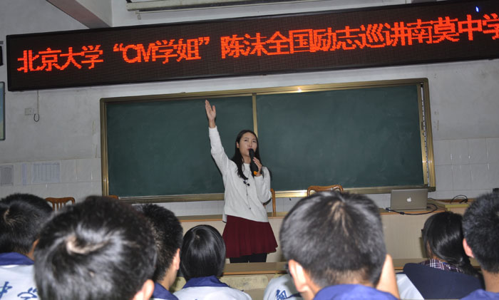 10月28日下午,北京大学“CM学姐”陈沫应邀到南莫中学为初三以上年级的全体师生作了主题为“一人一梦”的励志演讲。演讲报告会由学校团委书记薛玉林主持。