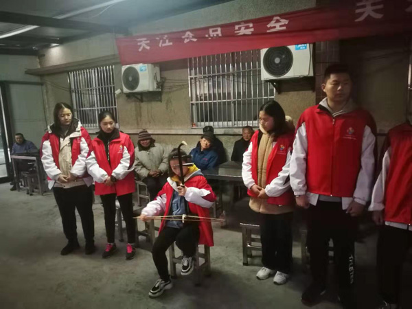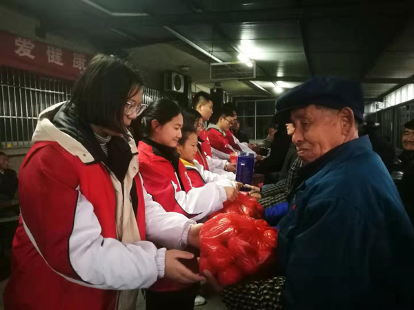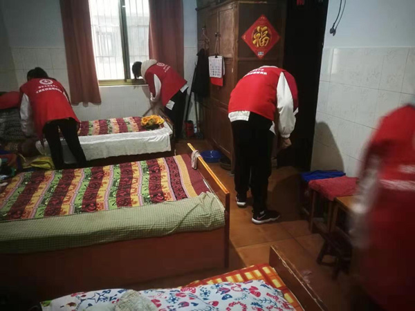 具有一定才艺的志愿者们在分工干部仇小卫和李宝盛的带领下来到沙岗敬老院,给老人们带来了香蕉、苹果等各种水果,为老人们表演了精心准备的各种节目,平日里十分安静的敬老院一下子热闹了起来,老人们的脸上洋溢着幸福的笑容。表演节目之余,志愿者们还拿起扫帚、抹布为敬老院打扫卫生,给老人们清洗衣物、整理床铺。离别前,老人们紧紧握住志愿者队员的手表示感谢,甚至有老人留下了感激的泪水。