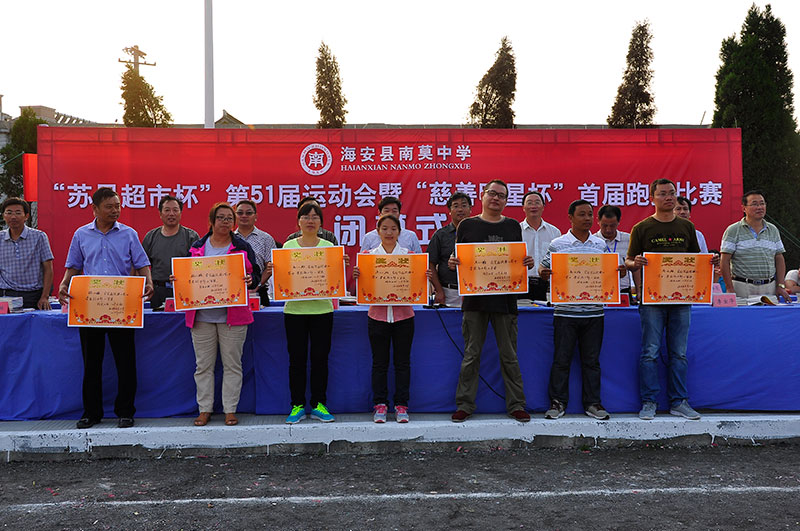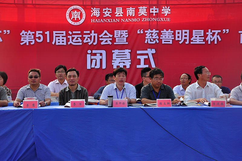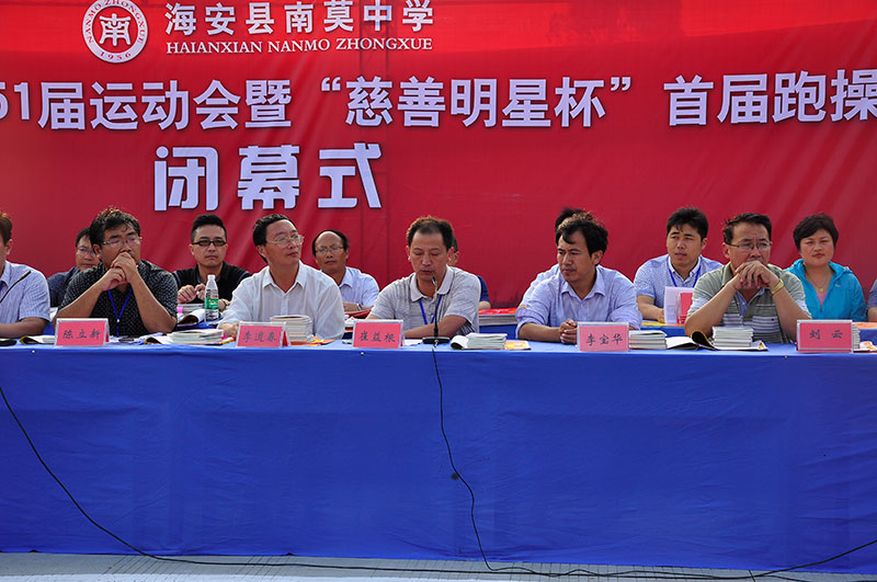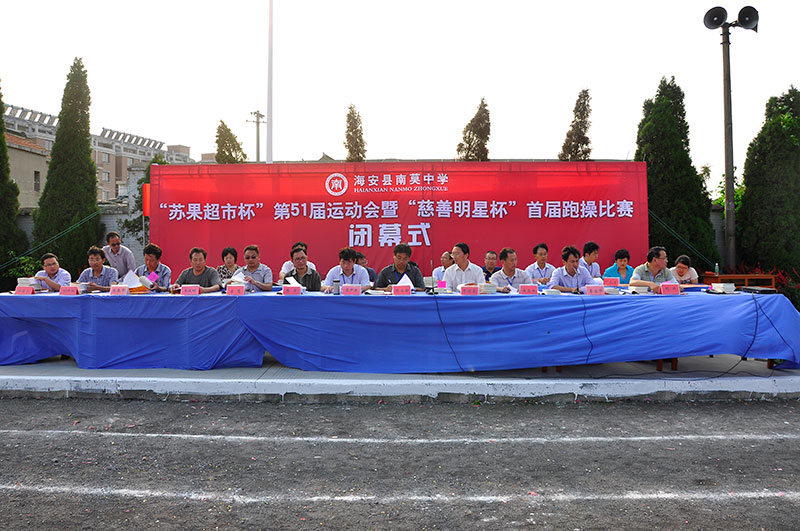 闭幕式在雄壮的国歌声中开始。首先,学校校长、党总支书记苏中潜致闭幕词。他对全体工作人员的辛勤劳动表示衷心感谢,对运动健儿取得的突出成绩表示热烈祝贺,希望大家继续努力,发扬奥运精神,积极开展“阳光体育”活动,促进学生全面发展。副校长崔益根公布了运动会各项比赛成绩以及文艺会演和首届跑操比赛的评比结果,接着进行颁奖仪式并合影留念。最后,苏校长宣布海安县南莫中学第51届运动会暨首届跑操比赛闭幕。