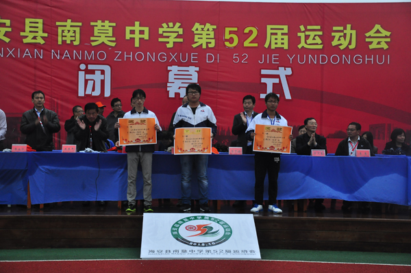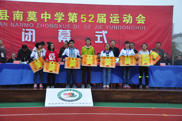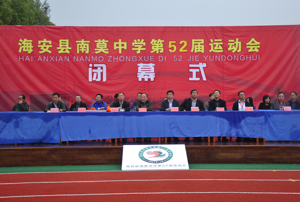 11月4日下午,秋雨绵绵,海安县南莫中学第52届运动会闭幕式暨颁奖仪式在学校田径运动场隆重举行。首先,学校副校长、大会组委会副主任崔益根致闭幕词。他对全体工作人员的辛勤劳动表示衷心感谢,对运动健儿取得的突出成绩表示热烈祝贺,希望大家继续努力,发扬奥运精神,积极开展“阳光体育”活动,促进学生全面发展。政教处莫春年主任公布了运动会各项比赛成绩以及南莫中学2015年“金秋十月”校园艺术节文艺联欢的评比结果,接着进行颁奖仪式并合影留念。最后,苏校长宣布海安县南莫中学第52届运动会胜利闭幕。