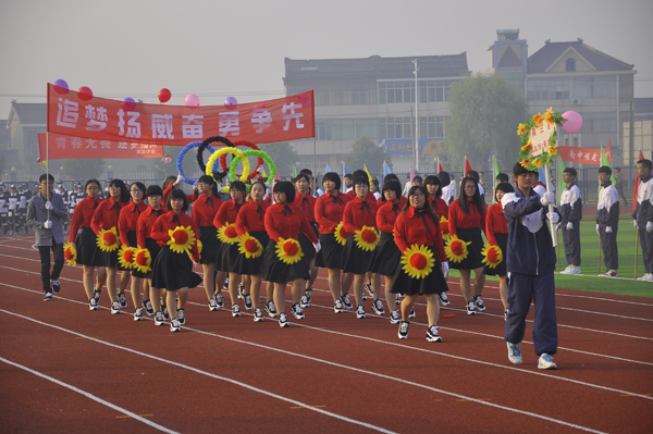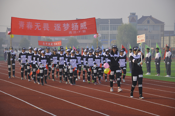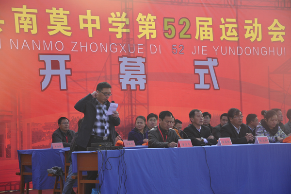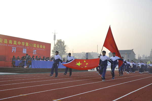 开幕式在庄严的国歌声中拉开了帷幕。首先进行的是精彩纷呈的入场式表演。仪仗队、号鼓队、运动员代表队、裁判员代表队身着各色鲜艳的服装,喊着嘹亮的口号,在雄壮的《运动员进行曲》伴奏下,迈着稳健整齐的步伐进入场。他们朝气蓬勃的笑脸、昂扬向上的斗志和色彩缤纷的彩旗花环交相辉映,充分展现了运动的活力和高昂比赛的热情,展示了南中师生文明向上、团结奋进的良好精神风貌。副校长崔益根致开幕词,他充分肯定了近年来学校体育工作所取得的突出成绩,希望全体工作人员恪尽职守,坚守岗位;全体裁判员公平、公正裁判;全体运动员顽强拼搏,赛出风格,赛出水平,保证此次运动会顺利圆满进行。接着,裁判员和运动员代表分别进行了宣誓。最后,学校校长、党总支书记、大会组委会主任苏中潜同志宣布海安县南莫中学第52届运动会开幕。
