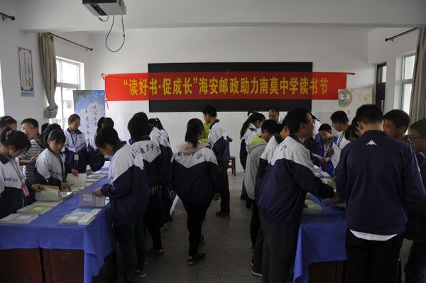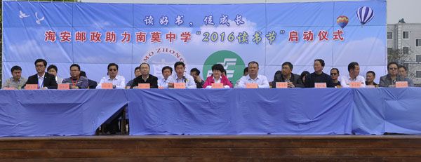 让读书成为习惯,让书香溢满校园。为提升全校师生的文化素养,营造浓郁的书香校园氛围,4月15日下午,海安县南莫中学在学校运动场隆重举行了“读好书,促成长”2016年校园读书节启动仪式。启动仪式由学校团委书记薛玉林主持,学校校长苏中潜、中国邮政集团公司海安分公司总经理宋小宾、中国邮政集团公司海安分公司副总经理邱郡、光明日报社市场部经理田杰以及学校中层以上全体干部在主席台就座,全校师生以及海安日报社、海安电视台等近2000人参与了启动仪式。