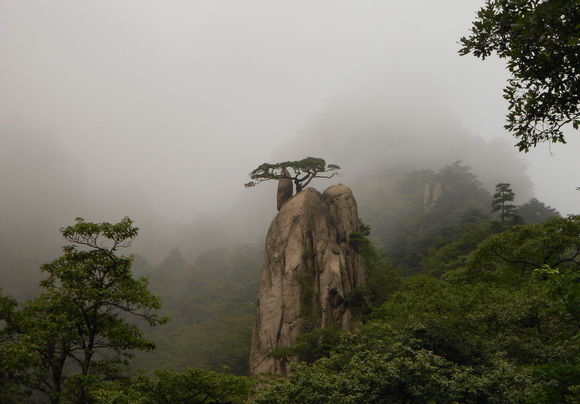但当我走到一处开阔地,却震惊了———原来我已在云巅。俯视:城似潜龙,山若伏鳖,馆阁楼台,隐若参差,远峰近树,依稀可辨,好似面对巨幅泼墨。我伫立良久,忽又见烟云散开,阳光乍泻,远处峰峦如屏,山色似黛,村舍相望,田莆纵横,又好似一副工笔长卷。而抬起头来,山顶却又似乎触手可得。